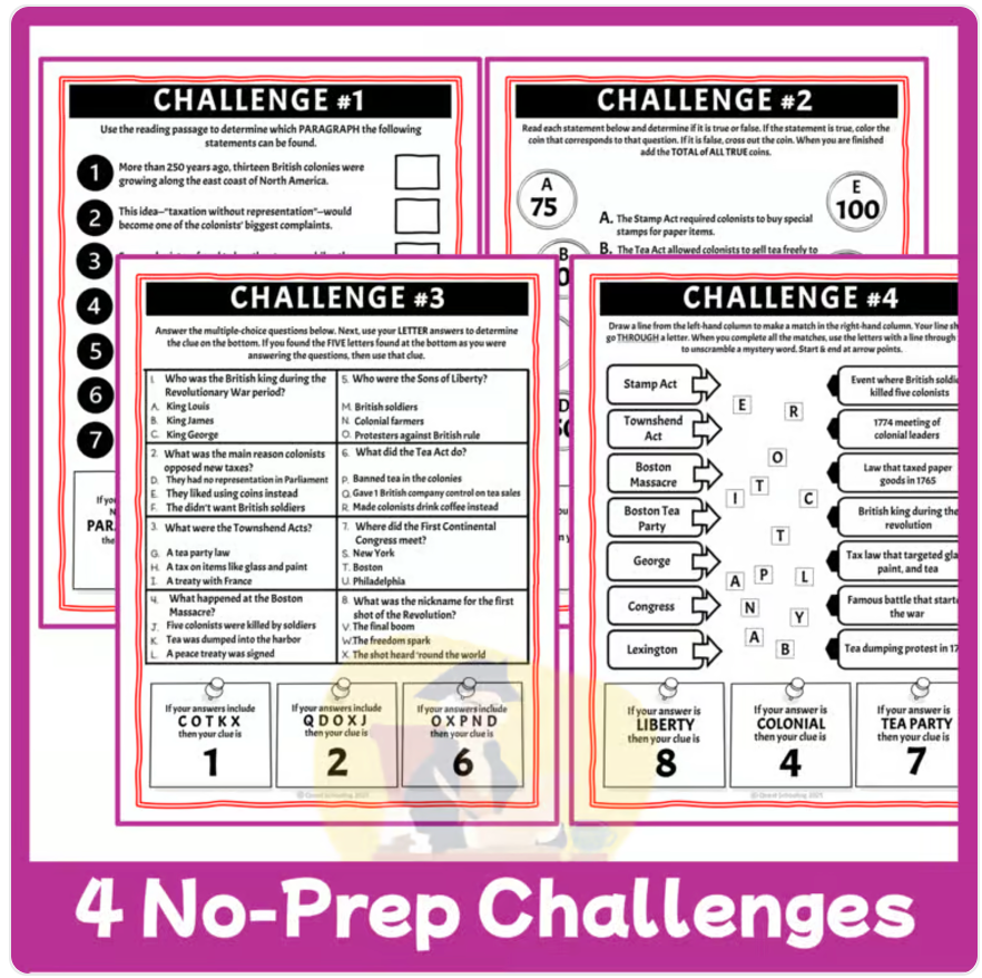 Designed for grades 4–6, this interactive activity helps students dig into the events and protests that led to the American Revolution while practicing reading comprehension, puzzle-solving, and critical thinking.